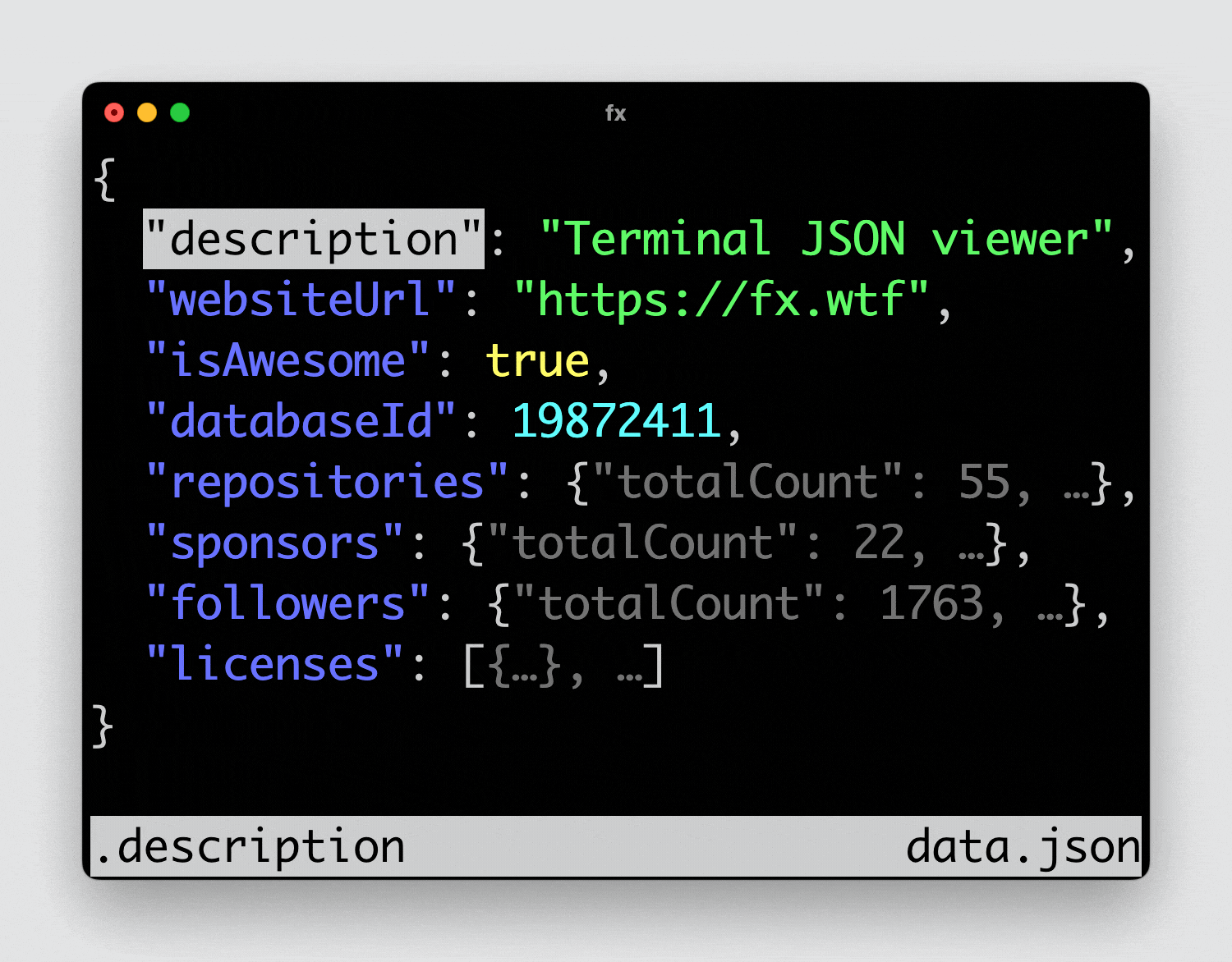 fx: fx 是一个处理 JSON 数据的命令行工具,可以进行数据解析,查询,过滤,修改和生成等操作。 安装:
