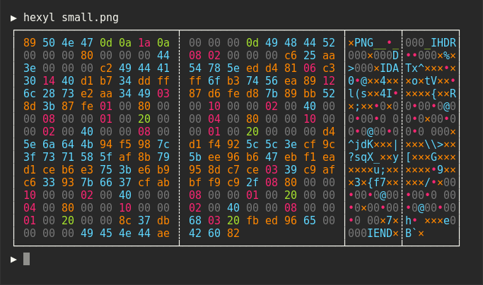 hexyl:hexyl 是一个用于终端的简单十六进制查看器。它使用彩色输出来区分不同类别的字节(空字节、可打印的 ASCII 字符、ASCII 空白字符、其他 ASCII 字符和非 ASCII 字符)。