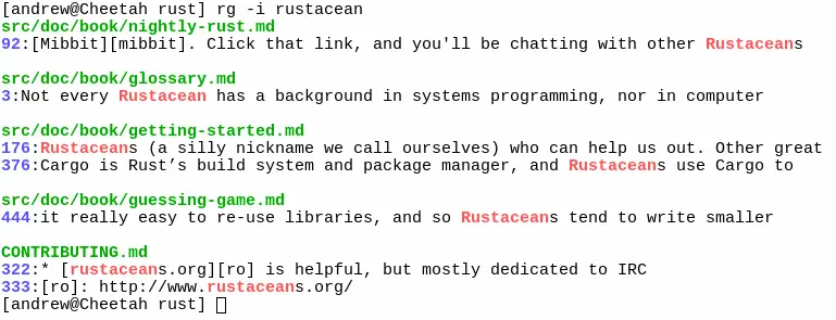 除此之外,ripgrep 默认过滤、更少的错误、Unicode 支持、带有行号和搜索词高亮。